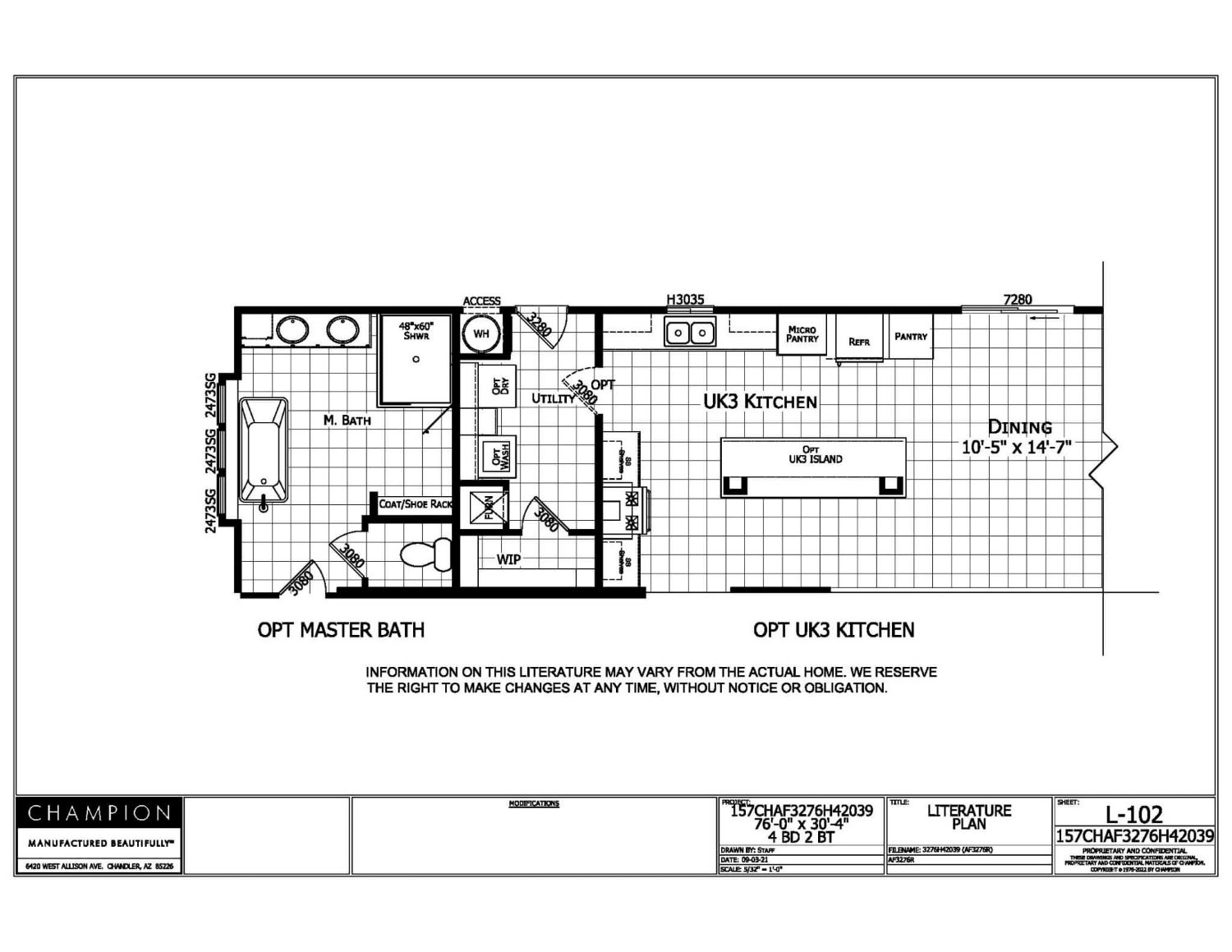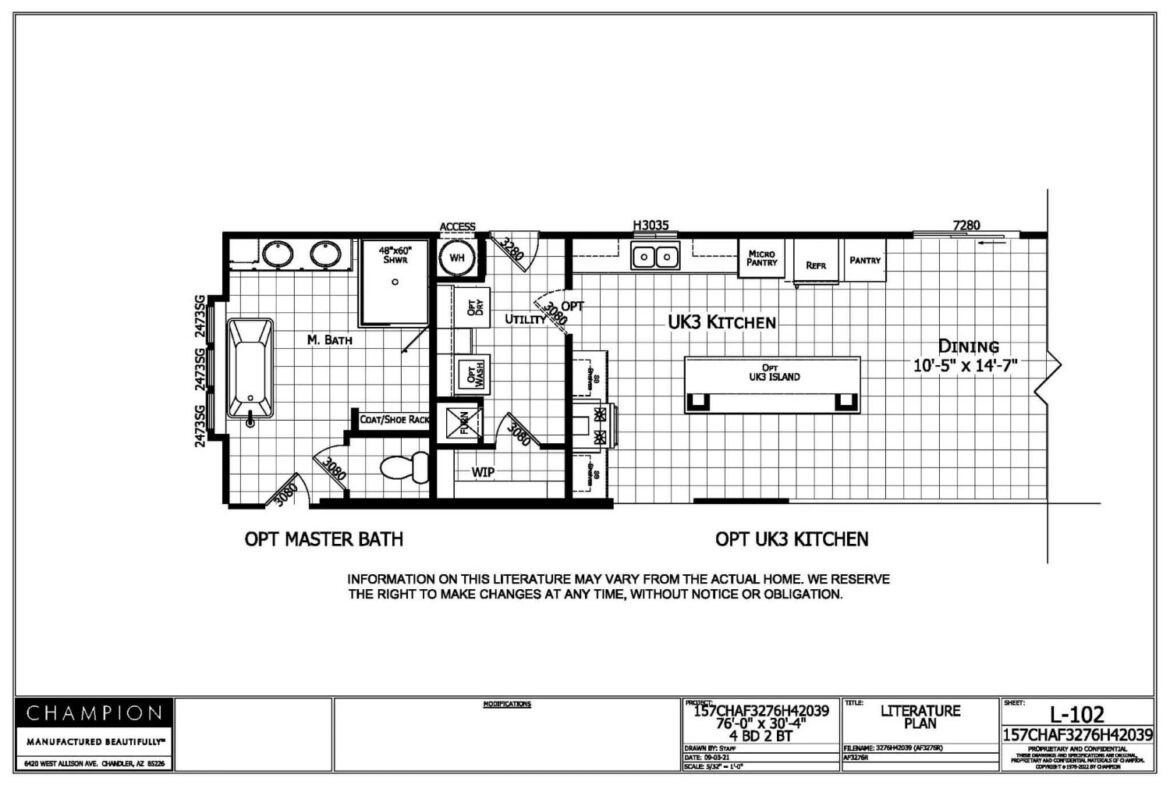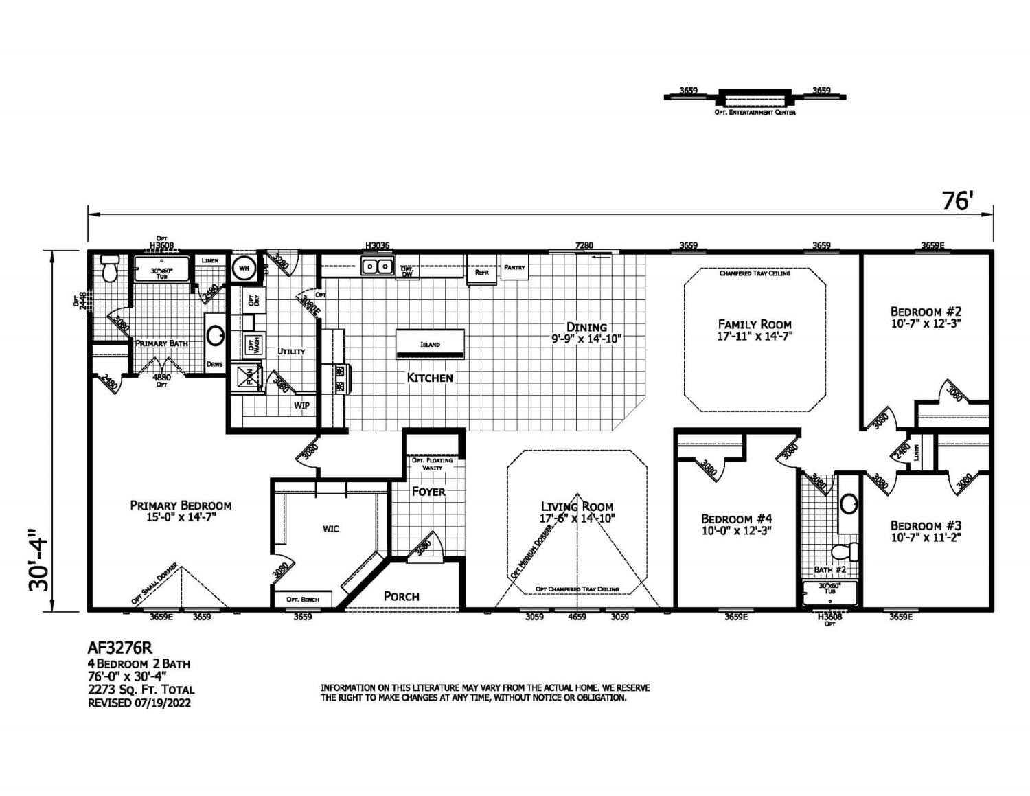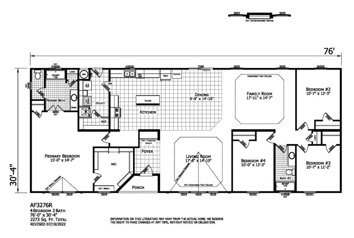 Introducing the American Freedom AF3276R plan – a spectacular 76′ x 30′ – 4″ 2273 sqft home with four bedrooms and two bathrooms that offers plenty of space and great value for your money. From the generous formal living room that opens up to the welcoming kitchen and dining area to the remarkable primary suite, the American Freedom AF3276R plan has it all.