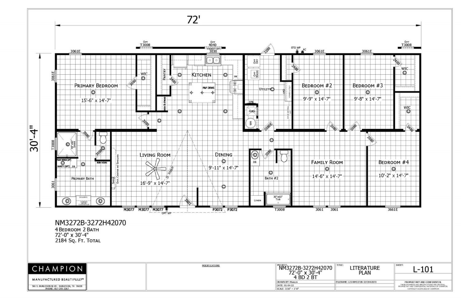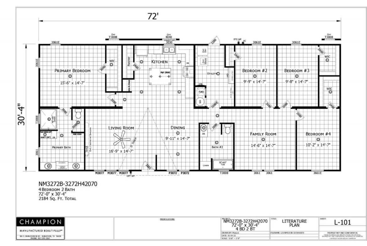 This amazing Champion NM3272B is a double-wide home that offers 2184 square feet of living space in a beautiful 4 bedroom, 2 bathroom design. Upon entering, you’re welcomed to a spacious family room with an open floor plan, perfect for entertaining friends and family.