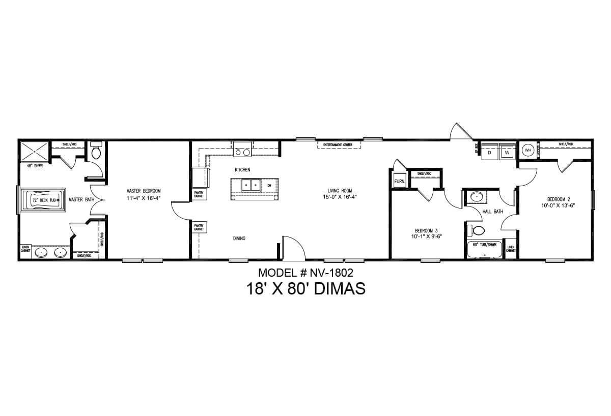 The Dimas is a value-oriented single-wide home from New Vision. This home features the family-preferred easy-flow floor plan with zero wasted hallway space, a master bedroom, and an ensuite featuring a platform soaking tub, stall shower, and dual sinks privately located away from guest bedrooms and a second bath, with spacious living and beautiful well-equipped kitchen at the center of floor plan layout, laundry/utility room at the rear exit door.