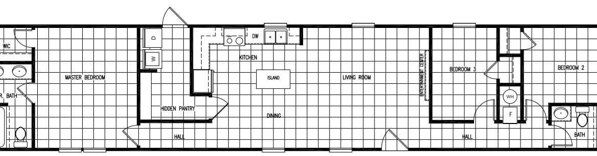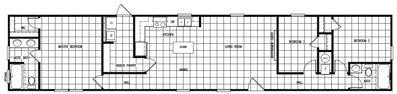 The McRae is our newest addition to the New Vision Singlewide Line-up, and it has some unique features that anyone can appreciate. It has a spacious living room and kitchen and a wide-open floor plan. This home’s most notable unique feature is the hidden pantry/utility room. When the pantry door is closed, it looks like any other kitchen cabinet. However, it is hiding the entire utility room. This is a perfect layout for those that don’t want people looking into your laundry area. This home is a must-see.