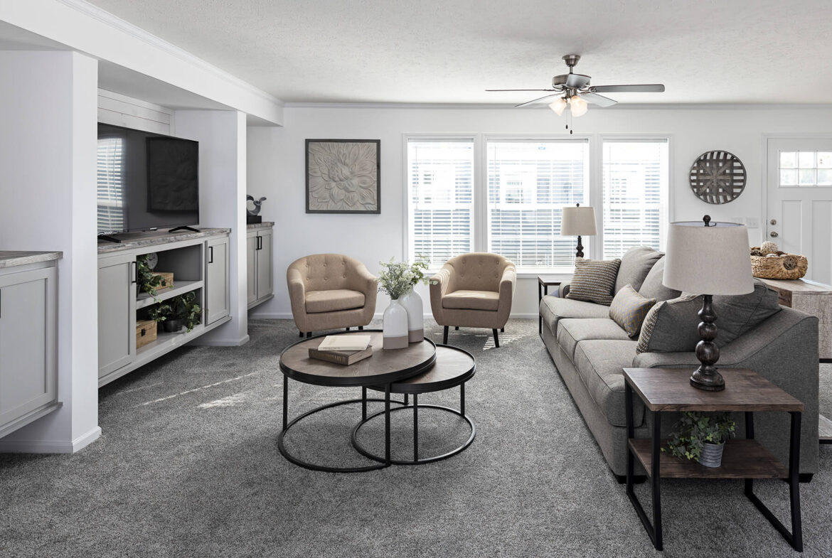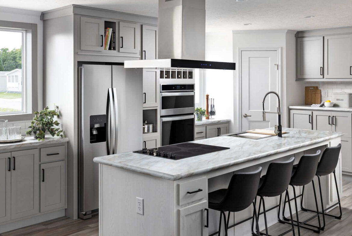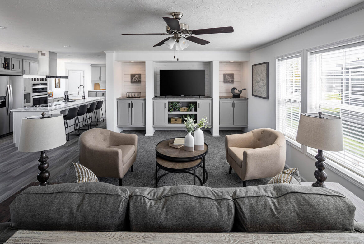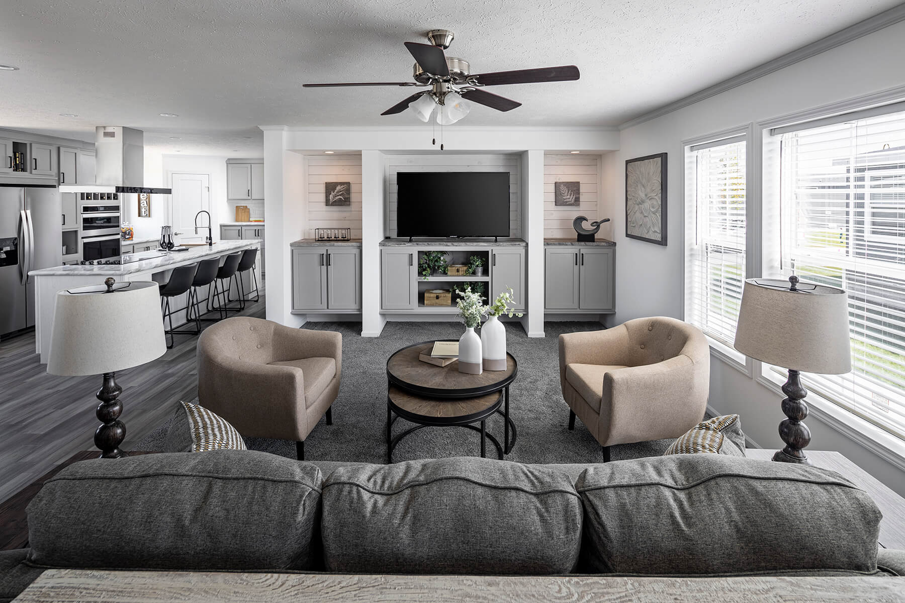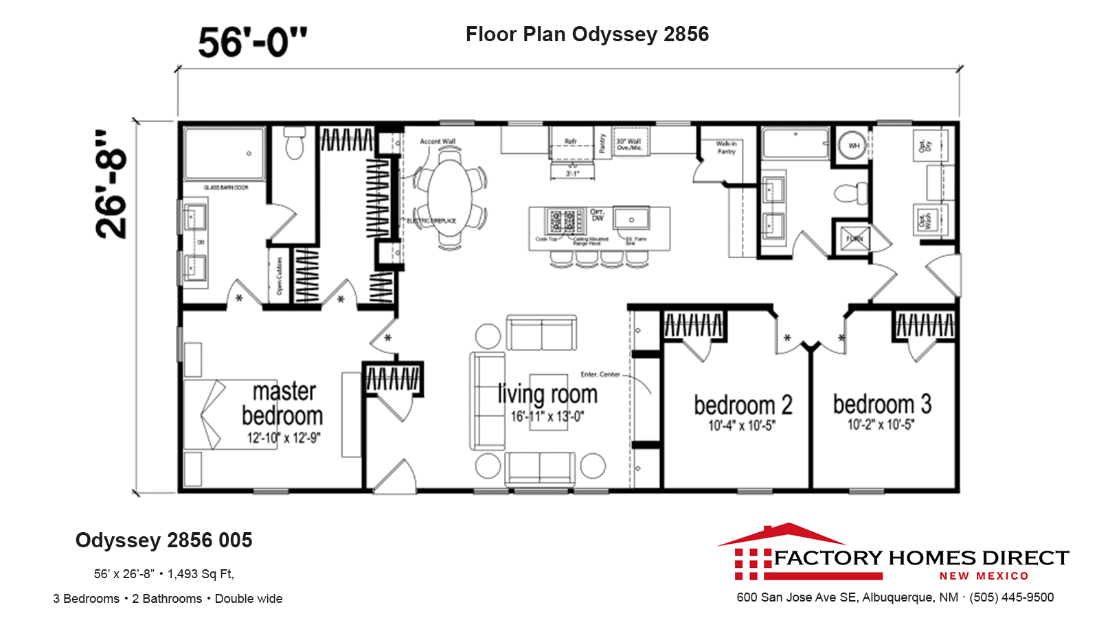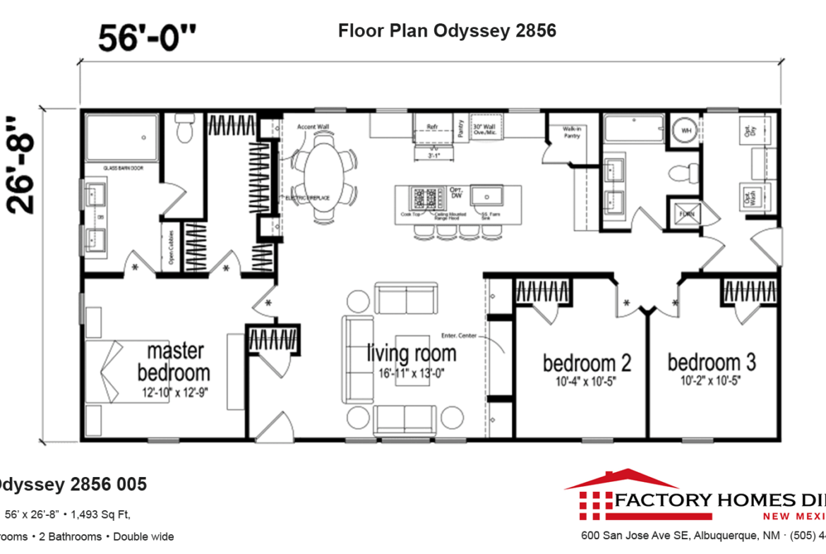 The Odyssey 2856 is a 56-foot long by 26-foot 8-inch wide home. With 1493 square feet of living space, this home is perfect for a family looking for multiple bedrooms and bathrooms.
