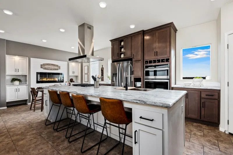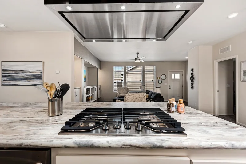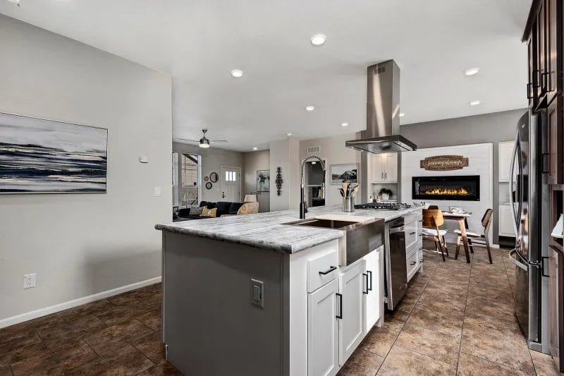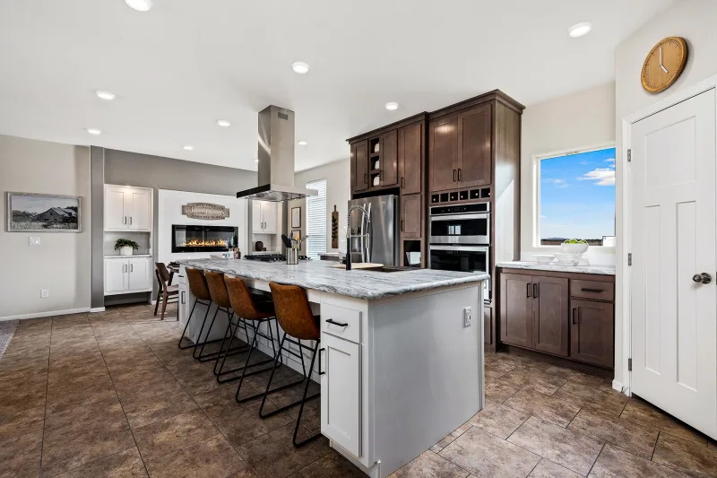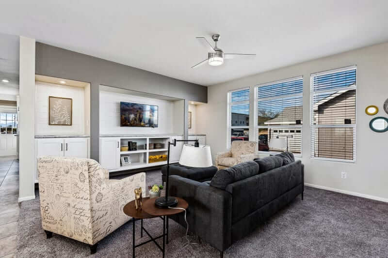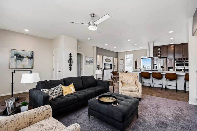 The home has a large living room open to the kitchen and dining area. The kitchen is well-equipped with a full-sized refrigerator, stove, microwave, plenty of modern cabinetry, counter space, and pantry storage.
