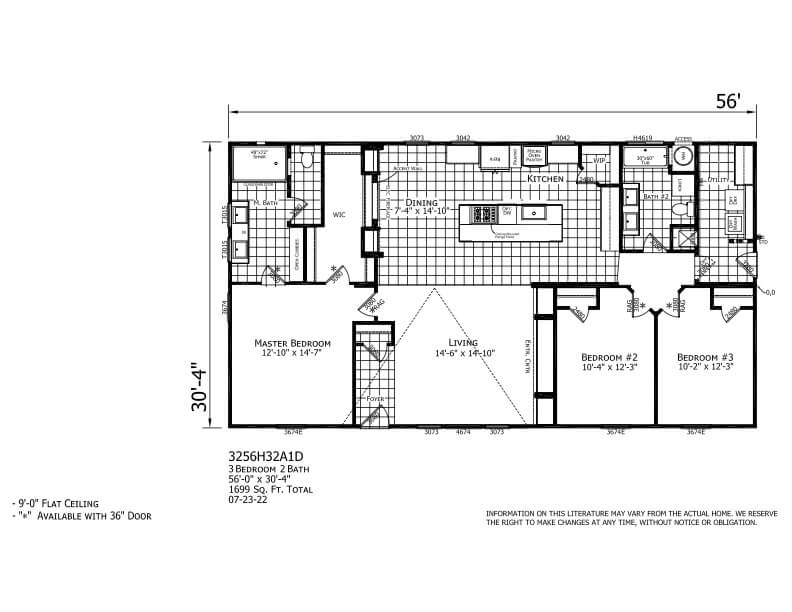 The Odyssey XL 3256 is an impressive 56′ x 30′-4″ home featuring a luxurious 1688 sq ft of livable interior space. This home has a functional and attractive layout with 3 bedrooms, 2 full bathrooms, and plenty of room for entertaining.