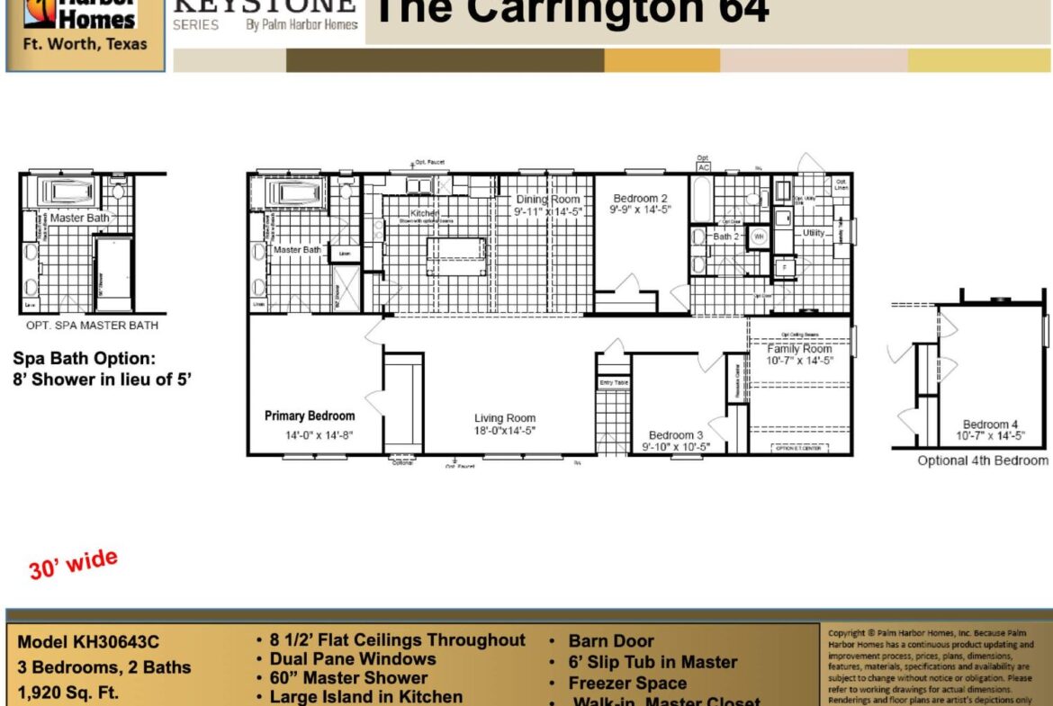 The KH30643C is a 64′ x 30′ (1920 SQ FT) 3 bedroom/2 bathroom double-wide home with many amenities, including:
